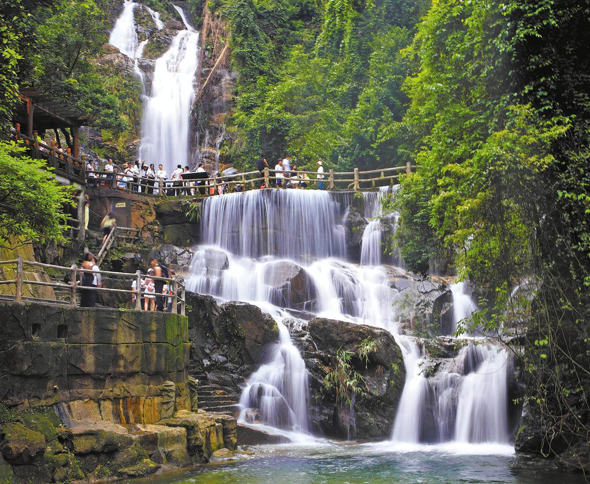 Visitors admire a waterfall in Dinghu Mountain reserve in May last year. (Liu Chunlin/Xinhua)