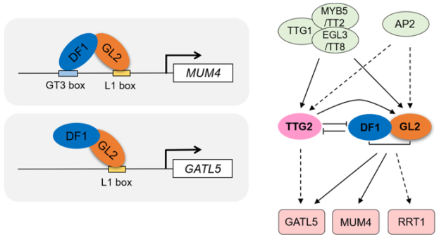 Gene expression analyses revealed that both DF1 and GL2 transcriptionally regulated the expression of pectin biosynthesis genes MUM4 and GATL5. Through chromatin immunoprecipitation-quantitative PCR and transcriptional activation assays, the researchers uncovered a cooperative mechanism of the DF1–GL2 module in activating MUM4 and GATL5 expression, in which DF1 binds to the promoters of MUM4 and GATL5 through interacting with GL2 and facilitates the transcriptional activity of GL2.