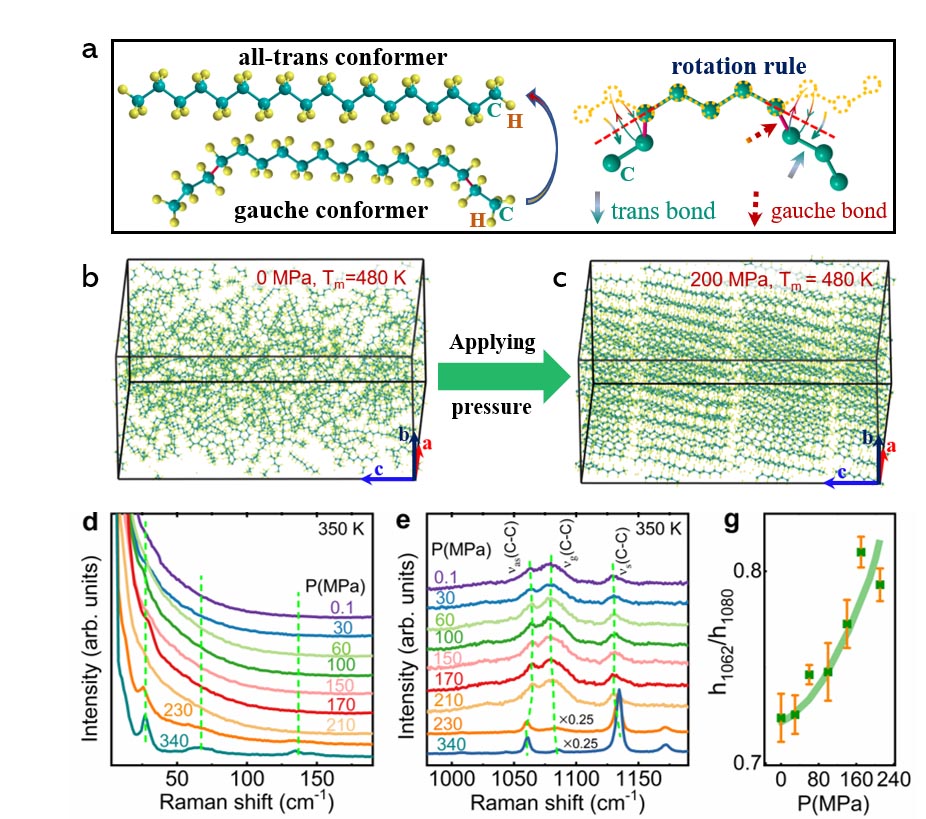 Fig. 2. The barocaloric mechanism revealed by Molecular Dynamics Simulation (a-c) and Raman spectra under different pressure (d-g). (Image by LIN Jianchao)