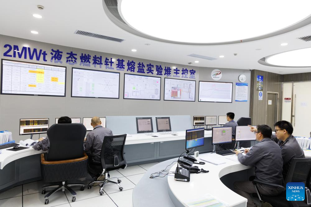 Researchers work in the control room of the experimental Thorium Molten Salt Reactor (TMSR) at the Wuwei campus of the Chinese Academy of Sciences' Shanghai Institute of Applied Physics (SINAP) in Minqin County of Wuwei City, northwest China's Gansu Province, Oct. 24, 2025. (Xinhua/Jin Liwang)