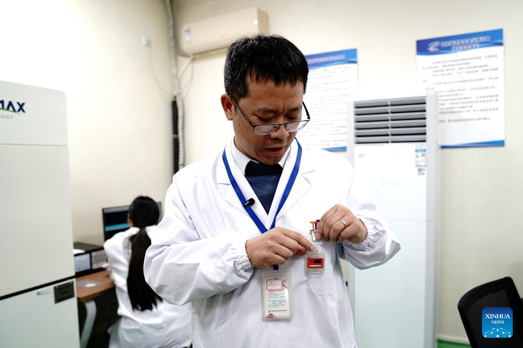 Researchers take out fuel salt samples at the Wuwei campus of the Chinese Academy of Sciences' Shanghai Institute of Applied Physics (SINAP) in Minqin County of Wuwei City, northwest China's Gansu Province, Oct. 24, 2025. (Xinhua/Zhang Jiansong)