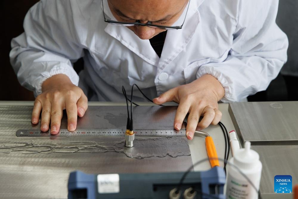 A researcher checks the welding quality of alloy materials used in building the Thorium Molten Salt Reactor, at a laboratory of the Jiading campus of the Chinese Academy of Sciences' Shanghai Institute of Applied Physics (SINAP) in east China's Shanghai, Oct. 23, 2025. (Xinhua/Jin Liwang)
