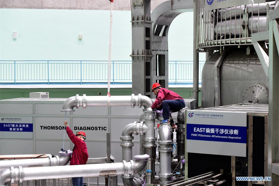 Staff members perform an upgrade to the experimental advanced superconducting tokamak (EAST) at the Hefei Institutes of Physical Science under the Chinese Academy of Sciences (CAS) on April 13, 2021. Chinese scientists have set a new world record of achieving a plasma temperature of 120 million degrees Celsius for a period of 101 seconds in the latest experiment on Friday, a key step toward the test running of a fusion reactor. The experiment at the experimental advanced superconducting tokamak (EAST), or the "Chinese artificial sun," also realized a plasma temperature of 160 million degrees Celsius, lasting for 20 seconds. (Xinhua/Zhou Mu)