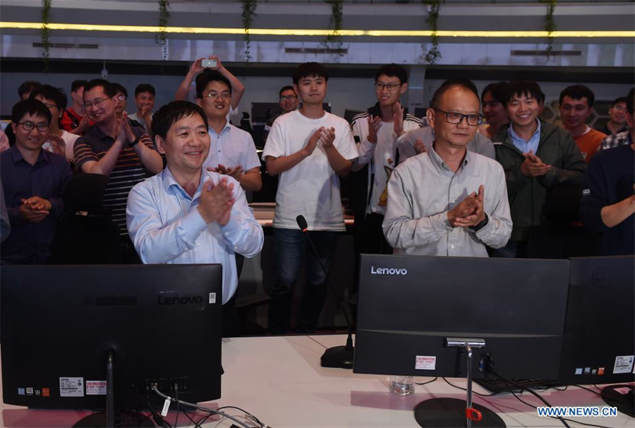 Researchers celebrate the success of experiment at the control center of the experimental advanced superconducting tokamak (EAST) on the early morning of May 28, 2021. Chinese scientists have set a new world record of achieving a plasma temperature of 120 million degrees Celsius for a period of 101 seconds in the latest experiment on Friday, a key step toward the test running of a fusion reactor. The experiment at the experimental advanced superconducting tokamak (EAST), or the "Chinese artificial sun," also realized a plasma temperature of 160 million degrees Celsius, lasting for 20 seconds. (Xinhua/Zhou Mu)
