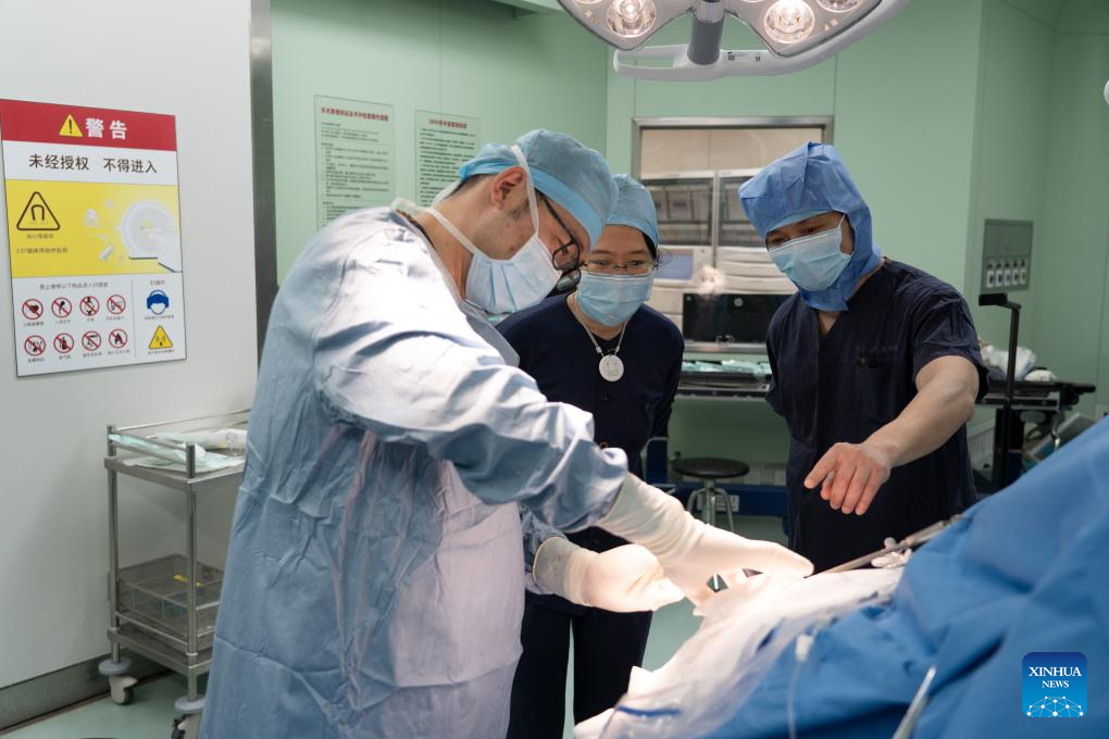 Doctors conduct the clinical trial of the invasive brain-computer interface in east China's Shanghai, March 25, 2025. (CEBSIT at CAS/Handout via Xinhua)