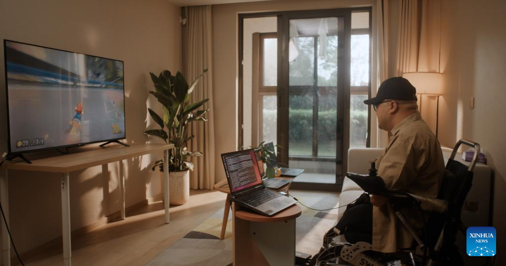 A patient who lost all four limbs in an accident plays racing game using only his mind after an operation in which a brain-computer interface (BCI) device was implanted in his brain in east China's Shanghai, April 30, 2025. (CEBSIT at CAS/Handout via Xinhua)