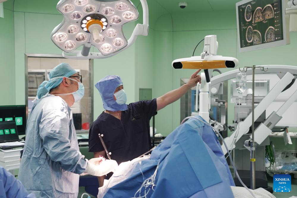 Lu Junfeng (L), principal investigator of the team from the Huashan Hospital, and Professor Wu Jinsong perform surgery on the first clinical trial patient in the operating room of Huashan Hospital affiliated with Fudan University, in east China's Shanghai, on March 25, 2025. (Photo by Chen Jie/Xinhua)