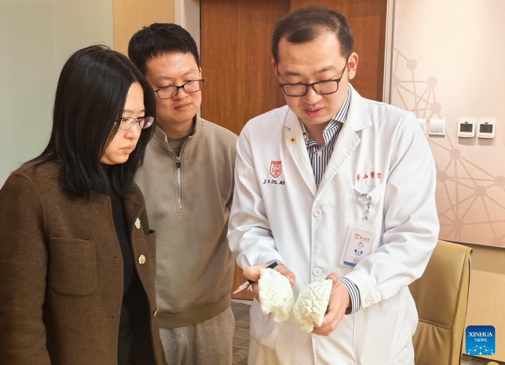 Zhao Zhengtuo (C), head of the research team, Li Xue (L), one of the leading researchers of the team, and Lu Junfeng, principal investigator of the team from the Huashan Hospital, make preoperative planning for the patient at Huashan Hospital affiliated with Fudan University, in east China's Shanghai, on March 22, 2025. (Photo by Chen Yaoxu/Xinhua)