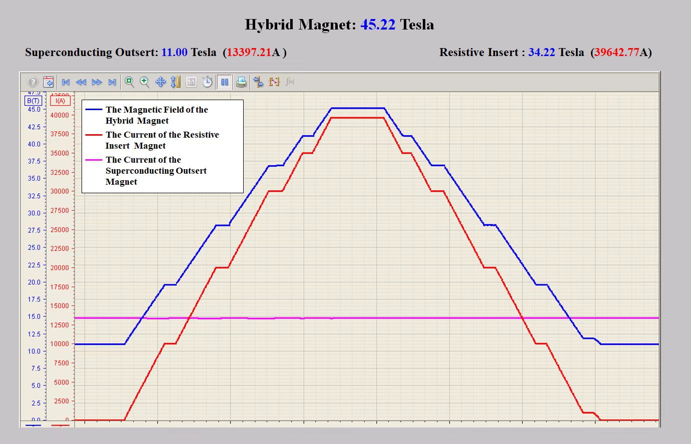 The hybrid magnet at the Steady High Magnetic Field Facility (SHMFF) in Hefei, China set a world record for the highest steady magnetic field by a working magnet when it produced a steady field of 45.22 tesla (T) on Aug. 12.