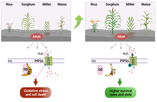 They found that aquaporins PIP2s in reactive oxygen species homeostasis may be involved in Gγ protein signaling. Genetic and cell biological analysis showed that Gγ negatively regulates the phosphorylation of PIP2;1, and the phosphorylation of aquaporins could modulate the efflux of H2O2, leading to decreased ROS levels in plants under alkaline stress.