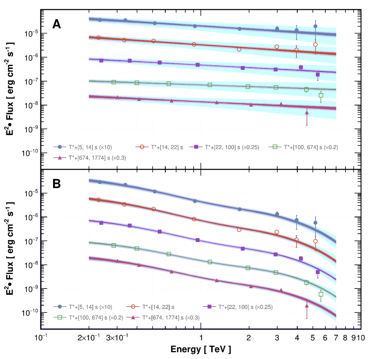 Figure 2: Intrinsic and observed spectra of photons measured by LHAASO at five time- intervals. The energy range is around 0.2-7 TeV. (Image by IHEP)