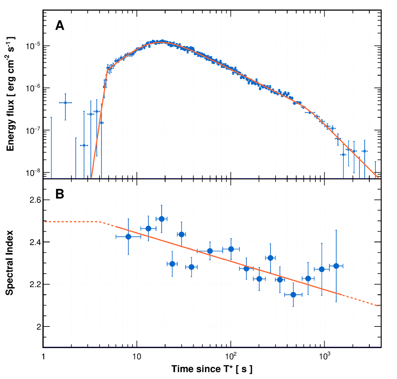 Figure 3: Energy flux light curve and spectral index evolution of the afterglow radiation from GRB 221009A, in the energy range of 0.3-5 TeV, along with the fitting function. LHAASO achieved the first complete observation of the afterglow of a GRB above 100 GeV, revealing the rapid rising phenomenon of the afterglow for the first time and discovering the rapid decay phenomenon in the afterglow of GRB221009A. (Image by IHEP)