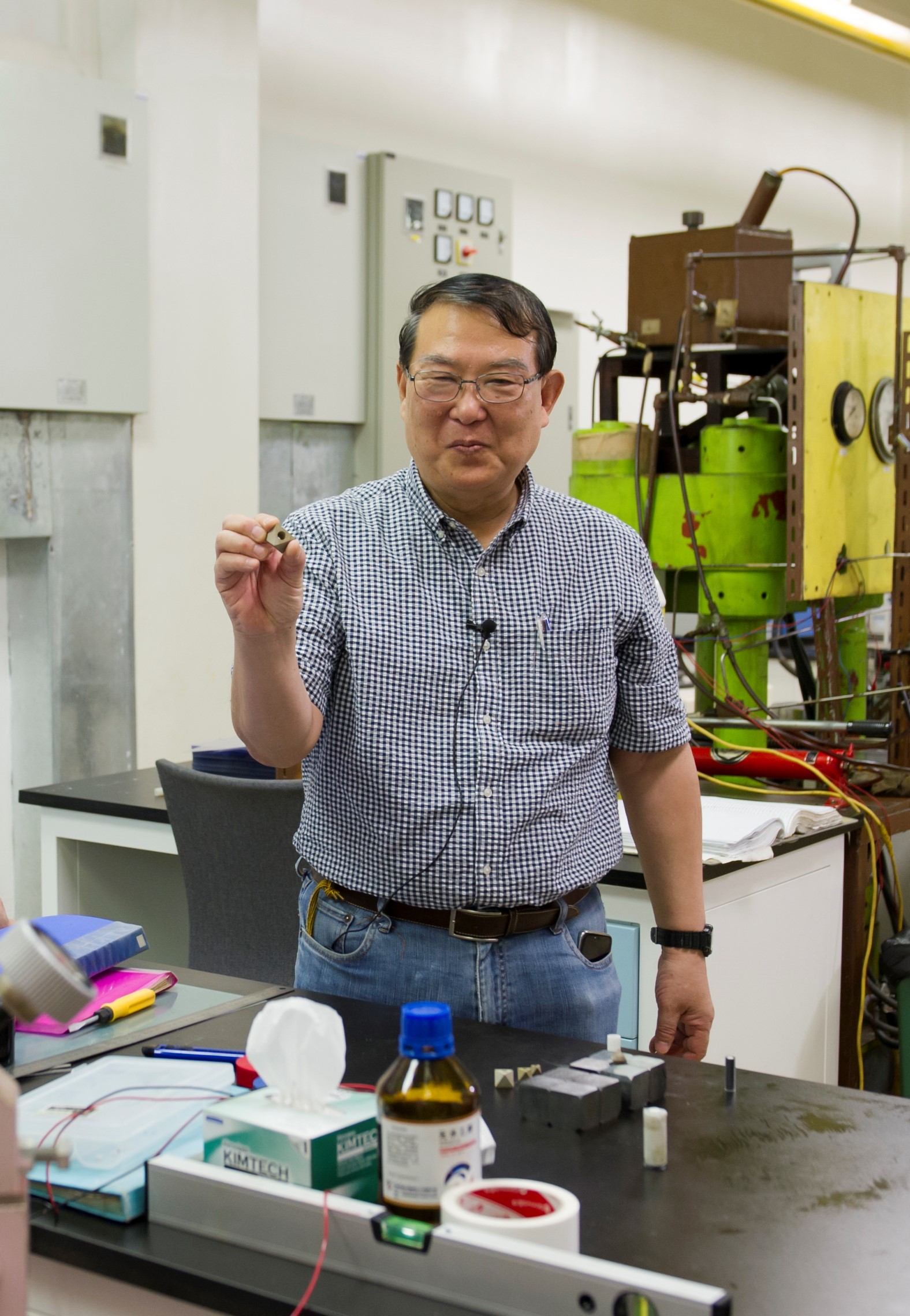 Takahashi shows in his hand the high-pressure assembly: MgO octahedral pressure medium. (Image by GIG)