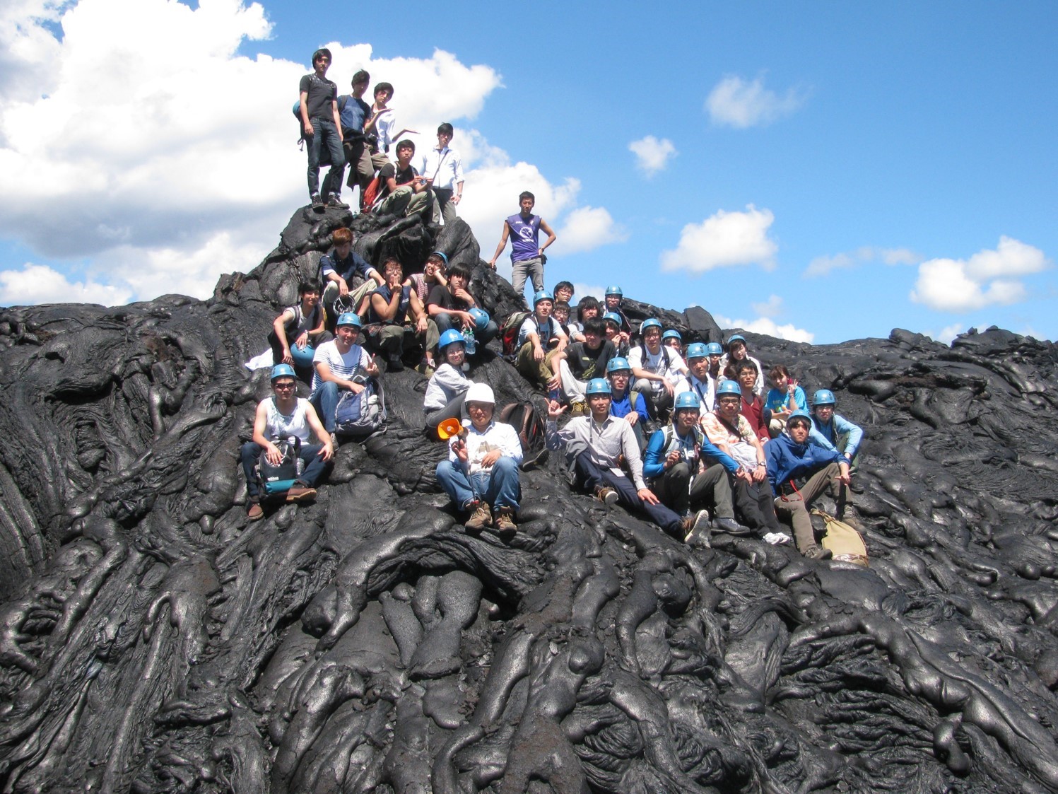 Takahashi (the one holding an orange loudspeaker at the center in the front row) takes undergraduates on a field trip to Hawaii for investigating lava. (Image by GIG)